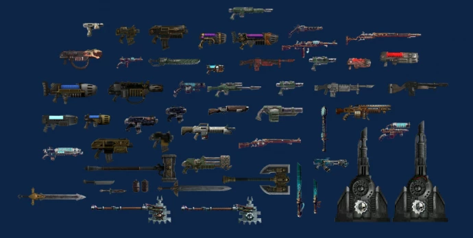 Мод добавляет оружие и броню: от стаб-пистолета до болтеров и ксенотеха. Для их создания нужны новые материалы: керамит, адамантий, термоплас, биоматериалы. Введены стационарные орудия — лазпушки, макроорудия, нова-пушки и болтерные турели.
