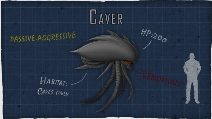 Встречается от Афотического Плато до Гидротермальных Пустошей.Пещерник: Пассивно-агрессивное существо, которое пытается избегать игроков, но при нападении может укусить и отравить морбузином.