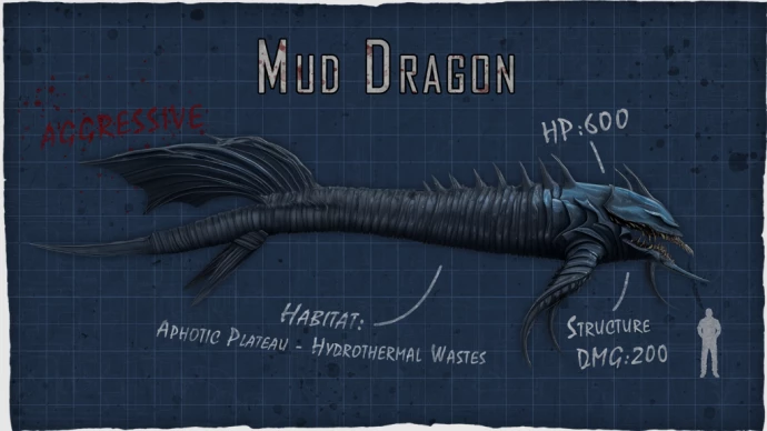 Встречается от Холодных пещер до Гидротермальных Пустошей.Грязевой дракон: Опасный одиночный хищник, способный разрушить корпус субмарины. Шансы на выживание при встрече с ним вне субмарины минимальны.