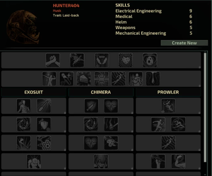 Играя за Хуска, можно развивать три пути: Экзоскелет (постоянный экзоскелет без источника питания), Химера (перераспределение тела для мощных атак и прыжков), и Проворность (быстрота и дополнительная сила для борьбы с фауной). У Хуска высокая живучесть, но его физическая форма ограничивает использование стандартных медикаментов.