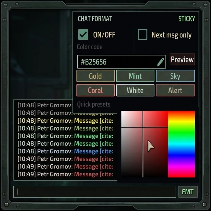 Мод добавляет компактную кнопку FMT рядом с полем ввода чата для быстрой отправки цветных сообщений.