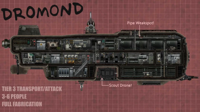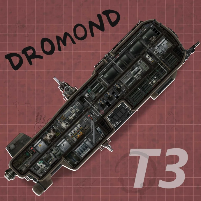 «Дромонды бросают вызов идее о том, что транспортные корабли должны быть беззащитными. Созданные с учетом агрессивной философии дизайна, эти суда могут перевозить грузы и оказывать сопротивление при необходимости. Этот конкретный экземпляр изношен, но функционален, и недавно прошел модернизацию, в результате которой под корпусом был установлен разведывательный дрон. Реактор «Дромонда» известен своим большим потреблением топливных стержней – компромисс, который делает его доступным для капитанов, готовых снизить затраты».