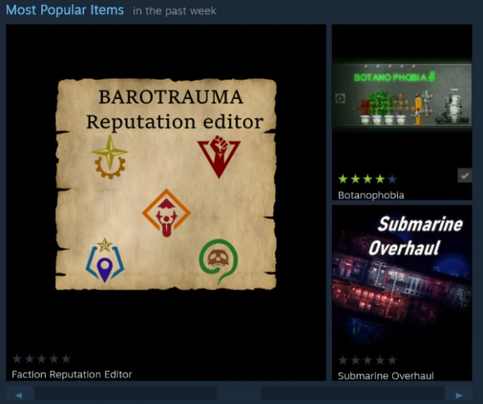 Мод «Faction Reputation Editor» для Barotrauma позволяет редактировать репутацию экипажа через субредактор или меню спавна. Размещение в подлодке предмета репутации определённой фракции даёт +1 или -1 репутацию выбранной фракции.