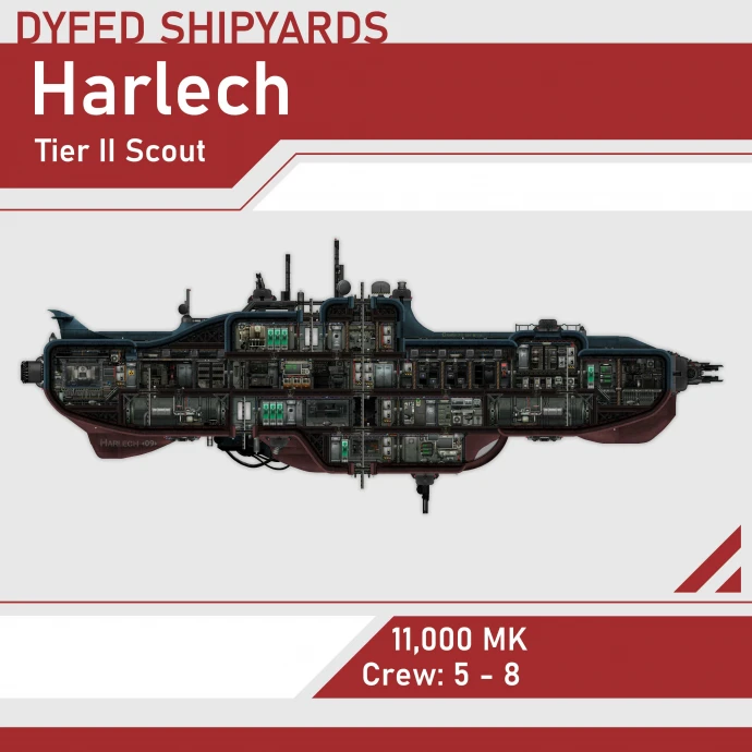 Построенная верфью Dyfed, Harlech – крупная разведывательная субмарина с усиленным вооружением для своего класса, однако энергосистема не рассчитана на полную боевую нагрузку. Изначально проект создавался как ударная подлодка Коалиции, но из-за габаритов и скорости её перевели в разведывательную роль. Единственное тяжёлое орудие – рельсотрон с ручной зарядкой, совместимый с бортовыми конденсаторами.