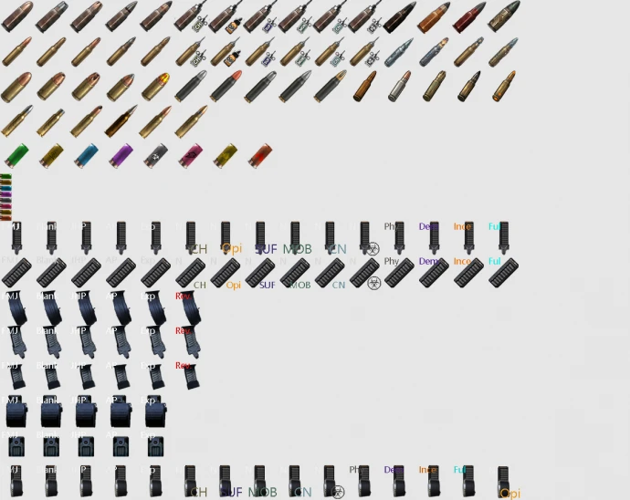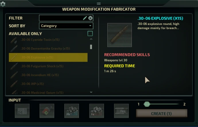 Все типы патронов изготавливаются на верстаке через интерфейс VGM. Для каждого калибра доступны варианты: холостые, экспансивные (JHP), бронебойные (AP), взрывные (Exp) и стандартные оболочечные (FMJ). Каждый тип имеет специализацию: некоторые эффективны против брони, другие предназначены для вскрытия помещений или имеют особое действие.