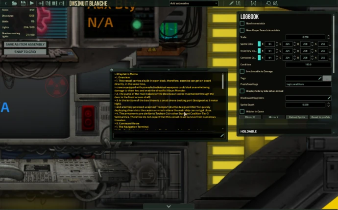 Мод «[MS]Nuit Blanche» для Barotrauma – корабль с открытым палубным пространством, разработанный в первую очередь для многопользовательской игры. В одиночной игре рекомендуется запретить ботам открывать двери центрального прохода, если они не способны справляться с врагами на борту.