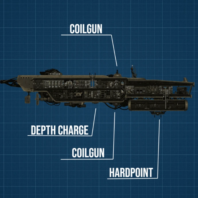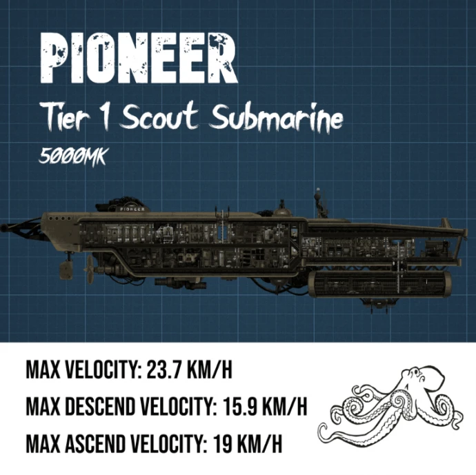 Pioneer – старый дредноут, мы уверены, что в своё время это был отличный корабль, но он давно выработал свой ресурс. Однако ONSC не так просто расстаётся с прибыльным судном. Поэтому мы отремонтировали, обновили и модернизировали эту подлодку для вас. Да, она выглядит старой, но системы, уверяем вас, современные, насколько это возможно за такой бюджет. Мы переделали её в разведчика, несмотря на её историю. Что поделать, разведчики просто лучше продаются.