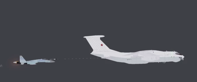 Ил-78 — советский самолёт-заправщик, построенный на базе Ил-76МД. Используется для дозаправки военной авиации прямо в воздухе с помощью системы «шланг-конус». Управление: H — двигатель, J — тяга вниз, U — тяга вверх, K — радар, N — шасси, B — открыть или закрыть кабину, M — начать заправку