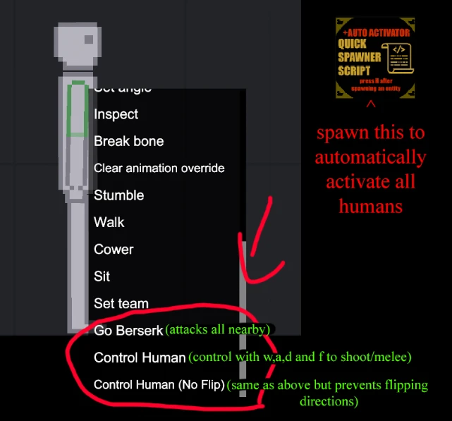 Также в Entities доступен скрипт, активируемый клавишей H. Он позволяет быстро спавнить активных людей и автоматически преобразовывать обычных людей и их скины (human reskins) в активных.