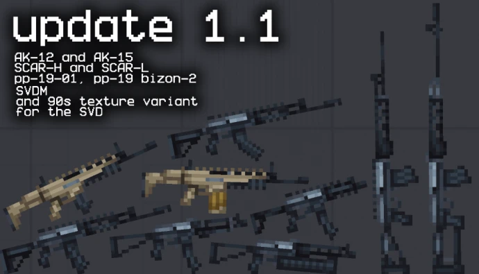 - Винтовки: AK-47, AKM, AKMS, AKMSU, AK-74 (2 текстуры), AKS-74 (2 текстуры), AKS-74u (2 текстуры), AK-12 (3 текстуры), AK-15 (3 текстуры), Wz. 88 Tantal, Wz. 89 Onyks, Wz. 96A Beryl, Wz. 96B Beryl, Wz. 96C Beryl, Wz. 96B Mini-Beryl, Wz. 96C Mini-Beryl, Beryl M762, Mini Draco, Micro Draco, M16A1, M16A2, M4A1 (2 текстуры), HK 416, SCAR-L, SCAR-H, SVD (2 текстуры), SVDS, SVDM, Tigr (2 текстуры).