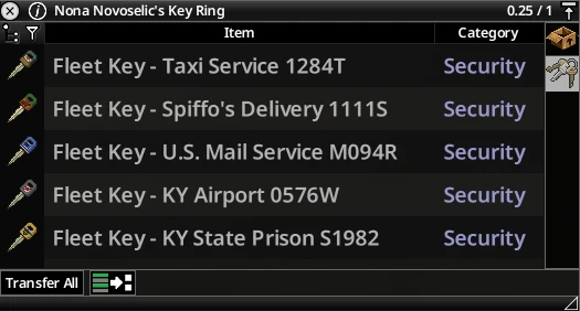 Изменяет некоторые обычные транспортные средства, чтобы они использовали одинаковые ключи. Такси, почтовые фургоны, служебные машины аэропорта, тюремные транспорты и фургоны Spiffo имеют свои собственные ключи автопарка. Например, если вы можете получить ключ от такси, он подойдёт к любому такси в Нокс-Кантри (и за его пределами!).