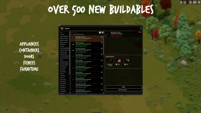 Мод «[B42] Buildables Expansion» для Project Zomboid расширяет стандартное меню строительства, добавляя десятки реалистичных и соответствующих лору объектов: мебель, технику, лестницы, заборы, полы, окна, освещение и другие элементы.