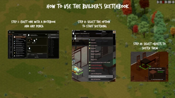 Builder's Sketchbook создаётся из тетради и ручки. Нарисованные в нём предметы разблокируются в основном меню строительства, если эскизный блокнот находится в инвентаре.