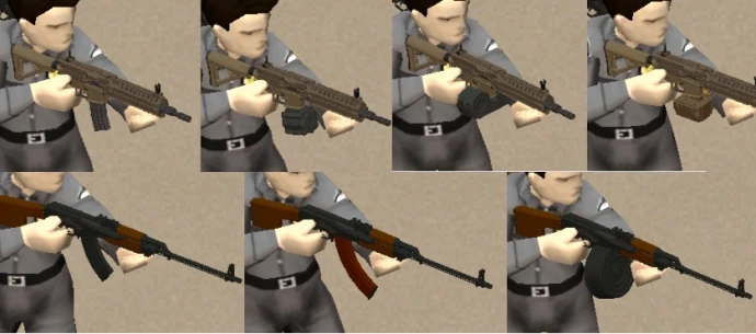 Разнообразие магазинов: для 5.56 AR доступны стандартный на 30 патронов, барабан на 60, сдвоенный барабан на 100; аналогично для АК и 7.62 AR.