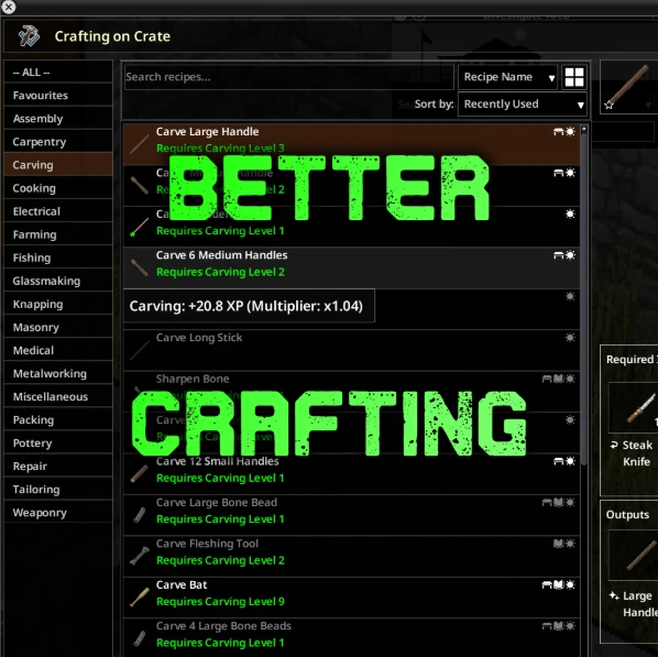 Мод «Better Crafting» для Project Zomboid улучшает интерфейс крафта: при наведении на рецепт появляется подсказка с точным количеством опыта (XP), которое вы получите.