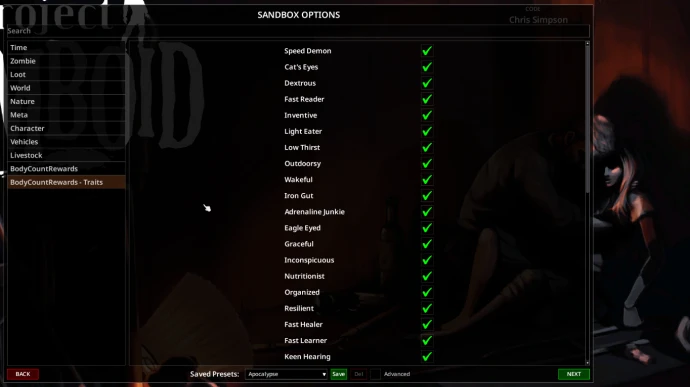 Мод «Body Count Rewards [B42.13.2 MP/SP]» для Project Zomboid даёт награды в виде черт персонажа за убийства зомби. Работает как в одиночной, так и в многопользовательской игре.