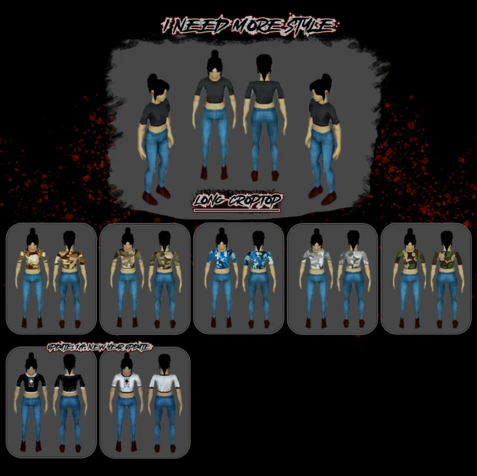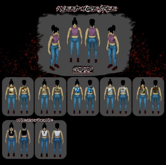 Мод добавляет в игру новую одежду. Большинство топов доступны в 5 различных камуфляжных расцветках для адаптации к условиям окружающей среды. Это объединённая версия модов «I Need More Style»; использование отдельных версий («ONLY») и версии «Clothing Edition» одновременно не поддерживается.