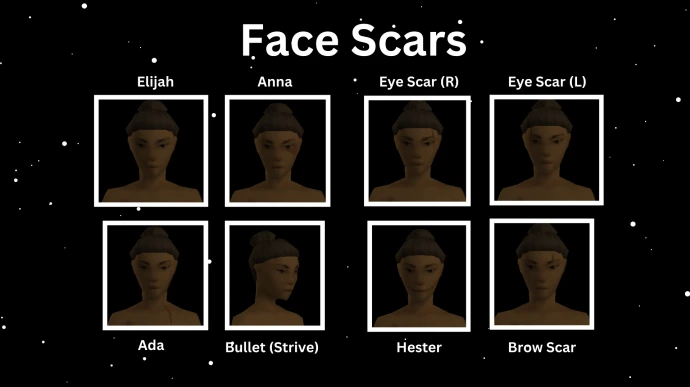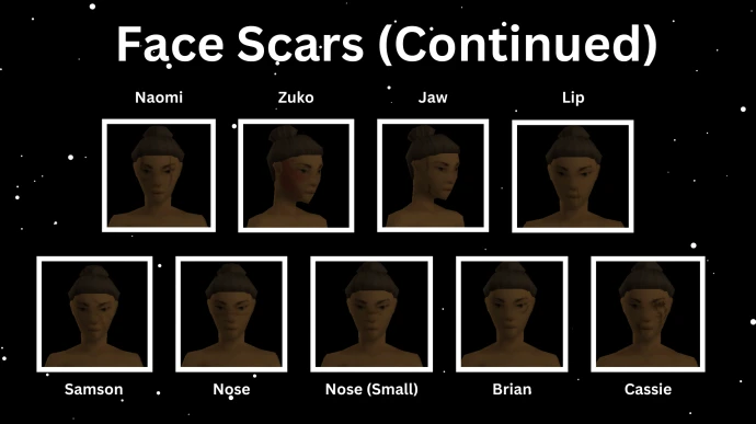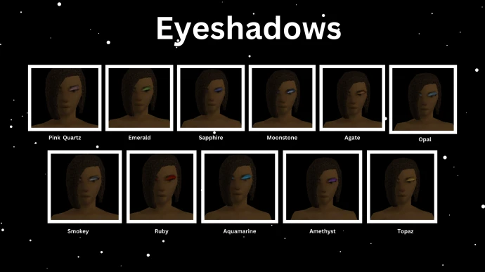 - PALSJ's Palettes: Двухцветные помады, тени для век, лаки для ногтей, контактные линзы (доступна гетерохромия), румяна (светлые, средние, темные), веснушки, мешки под глазами и множество шрамов.