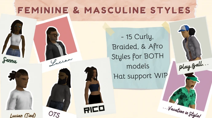 - PALSJ's Poofs: Набор причесок, включая афро-пучки (в стиле Аманды и Клементины), локоны (Люциан, Сенна, Бек, Шанти, Шторм), косы (OTS, Рико, Киллмонгер, короткие свободные косы, заплетенный пучок) и другие варианты (небрежный пучок, хвост, короткое каре).