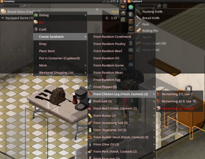 - Сортирует приправы и ингредиенты по возрастанию остатка при приготовлении эволюционировавших рецептов (супы, сэндвичи).
