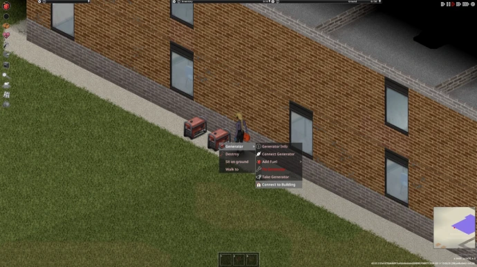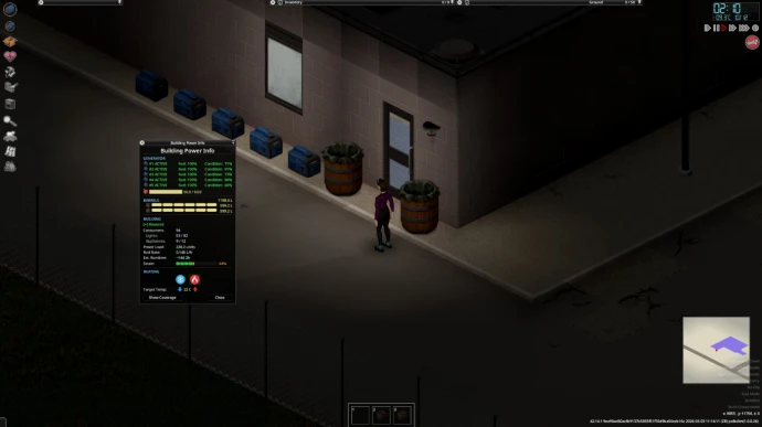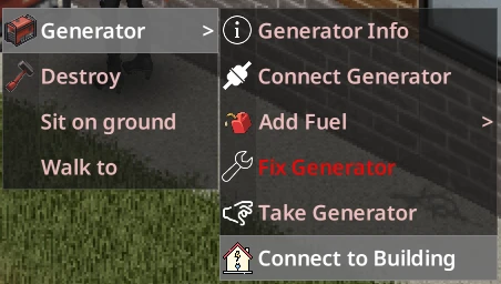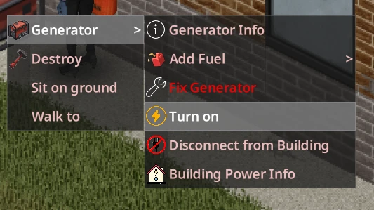 Доступ к окну Building Power Info: нажмите на выключатель света, когда в здании есть электричество (Генератор -> Подключить к зданию -> Включить).