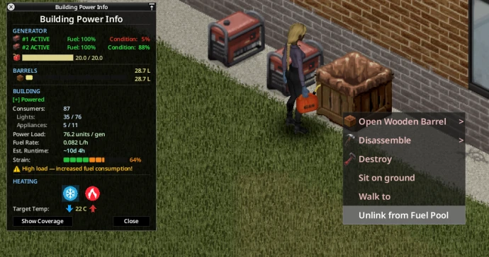 - Окно Building Power Info с данными о топливе пула, состоянии, нагрузке, потреблении энергии, активных потребителях, связанных бочках и данных отопления.