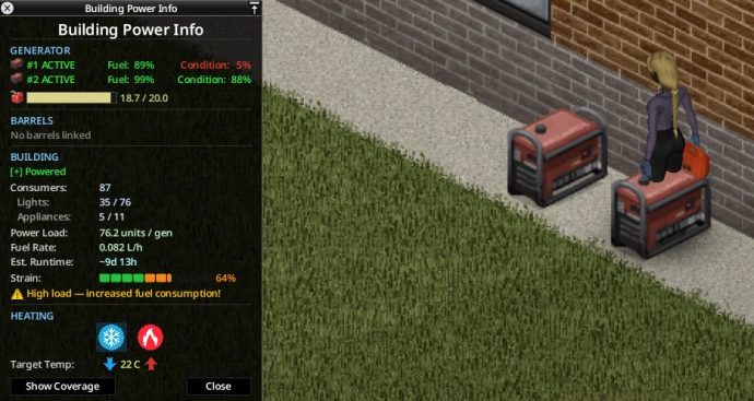 - Система нагрузки: если здание слишком велико для активных генераторов, расход топлива увеличивается.