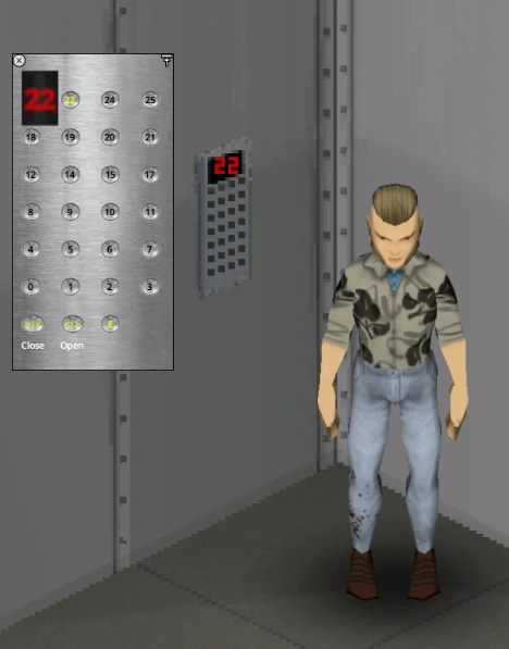 – Клавиша «Interact» и левый клик вызывают действия: вызов лифта, закрытие дверей, подъём по лестнице.