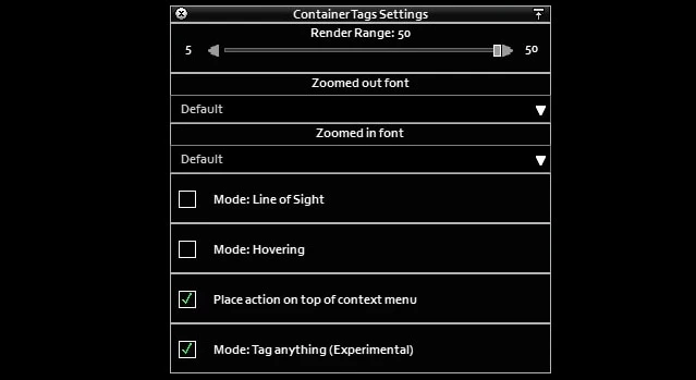 Мод добавляет возможность присваивать текстовые метки любым контейнерам в игре через контекстное меню и пользовательский интерфейс.