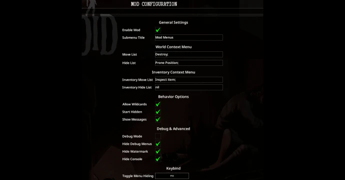 - Расширенные паттерны Lua: Поддержка точного совпадения, подстановочных знаков и сложных шаблонов Lua для сопоставления пунктов меню (настраивается отдельно для мира и инвентаря).