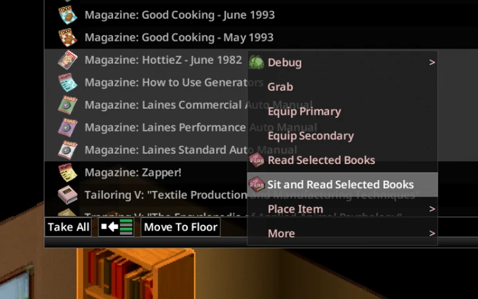 - Массовое чтение книг и журналов – можно выбрать несколько книг из инвентаря или контейнера, нажать правой кнопкой мыши и выбрать «Прочитать выбранные книги». Персонаж будет брать их по одной, читать и возвращать обратно.
