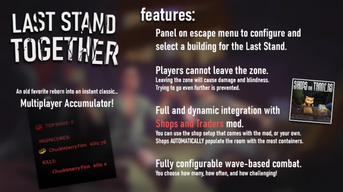 Мод позволяет создать зону выживания Last Stand в мультиплеере или одиночной игре. Вы и ваши друзья выбираете здание, после чего на него начинают нападать волны зомби. Цель – продержаться как можно дольше.