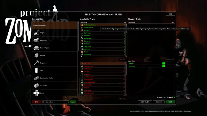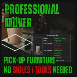 Мод «Professional Mover – Pick Up Furniture Without Skills/Tools» для Project Zomboid добавляет черту «Professional Mover» (–1), которая позволяет переносить мебель и предметы интерьера без навыков, инструментов и риска поломки.