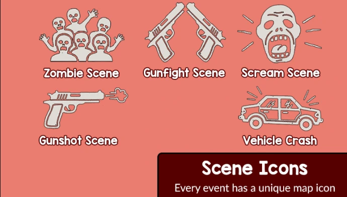 - 7 типов событий – перестрелка, выстрел, крик, ДТП, животные, погода, зомби.