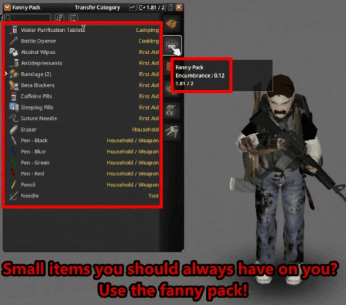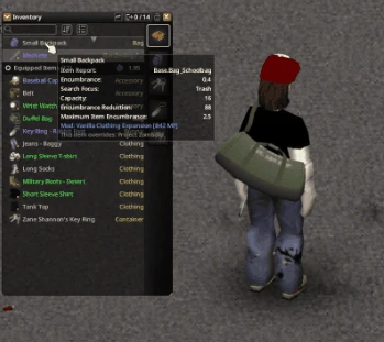- Перебалансировка контейнеров: изменены параметры большинства носимых контейнеров (рюкзаки, аптечки, кейсы и т.д.). Маленькие контейнеры (школьные рюкзаки, поясные сумки, сумки через плечо) больше не позволяют переносить очень тяжёлые отдельные предметы. В качестве компенсации они дают гораздо большее снижение веса, что делает их идеальными для постоянной переноски лёгких предметов первой необходимости.