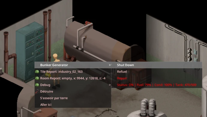 • Электросеть: Бункер работает от одного генератора с большим резервным топливным баком. Генератор можно запускать, останавливать, заправлять и чинить через контекстное меню (правая кнопка мыши). Уровень топлива и состояние агрегата ухудшаются со временем. Бак автоматически подает топливо в генератор при падении уровня ниже 75%. Заправка и слив осуществляются канистрами из инвентаря. Ремонт требует наличия электронного лома (генератор должен быть выключен).