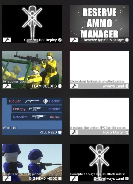 Вертолёты ищут зону посадки в пределах заданного радиуса, а таймеры регулируют частоту их появления и время, через которое застрявший вертолёт высаживает пассажиров. Есть настройки для агрессивного или фронтального развёртывания, а также возможность игнорировать зоны посадки, если вертолёты мешают друг другу.