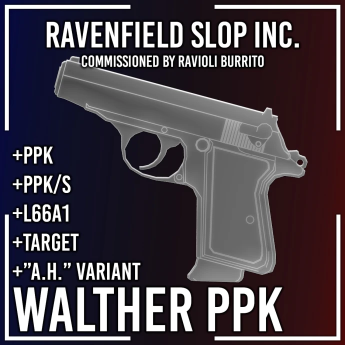 Мод добавляет пистолет Walther PPK. Оружие представлено в нескольких вариантах: PPK под патрон .38, PPK/S под патрон .380 и L66A1 под патрон .22.