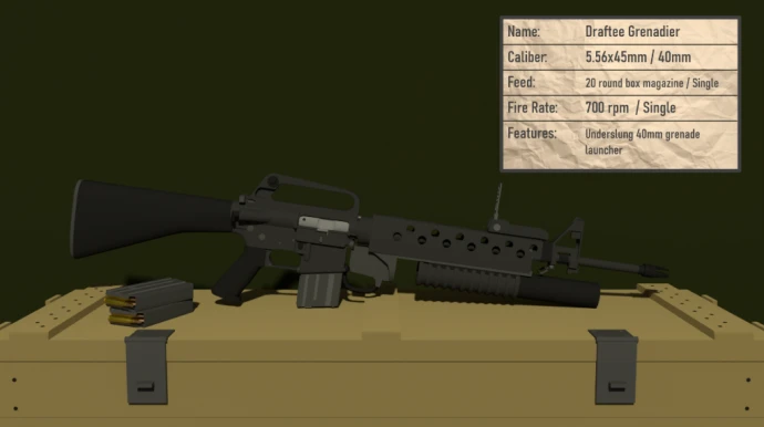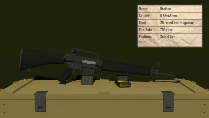 - DRAFTEE: Автомат M16 под промежуточный патрон. Магазин на 20 патронов, selectable режимы огня, умеренная отдача.