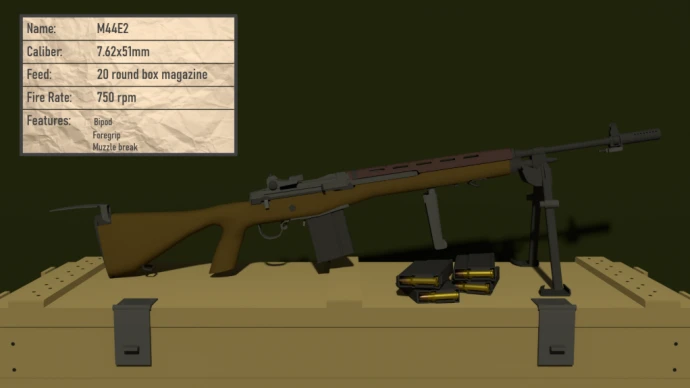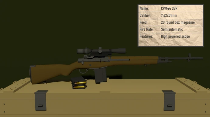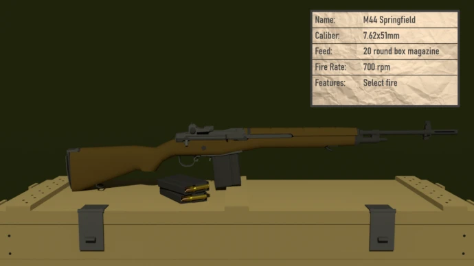 - M44 SPRINGFIELD BATTLE RIFLE: Самозарядная винтовка с деревянной ложей, полноразмерным патроном и высокой останавливающей силой. Эффективна при стрельбе одиночными.