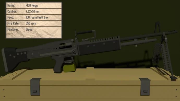 - M50 HOGG: Пулемёт с ленточным питанием на 100 патронов и утяжелённым стволом. Рекомендуется использование лёжа.
