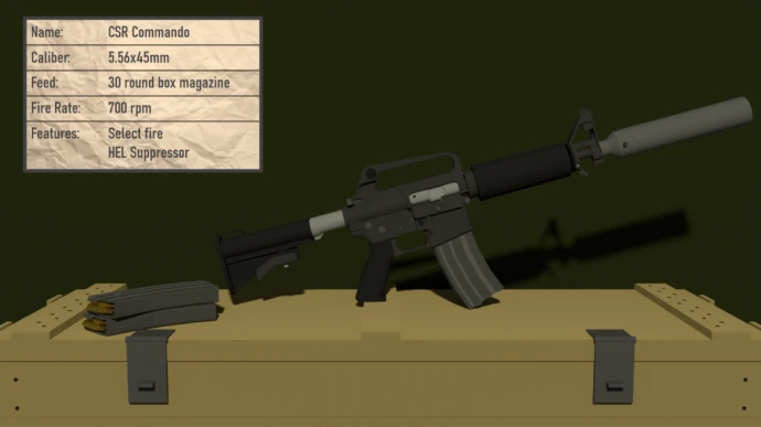 - CSR COMMANDO: Глушительный карабин для скрытного передвижения. Может использоваться как вторичное оружие.
