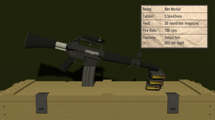 - WET WORKER: Укороченный карабин с магазином на 30 патронов и коллиматорным прицелом OEG. Повышенная отдача в автоматическом режиме.
