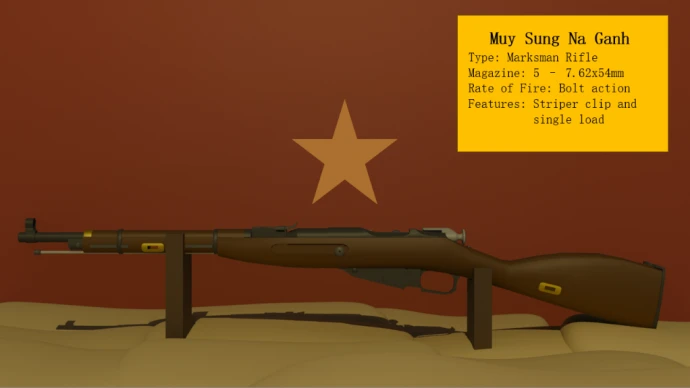 - Muy Sung Na Ganh – точная и мощная винтовка с низкой скорострельностью. Внутренний магазин на 5 патронов заряжается обоймой или одиночными патронами.