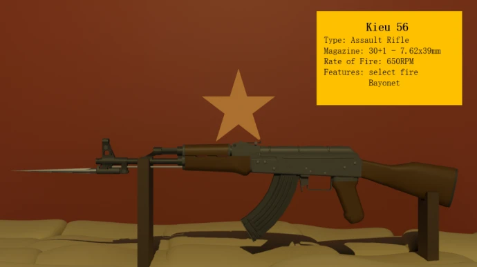 - Kieu 56 – стандартный автомат с магазином на 30 патронов, режимом выбора огня и штыком (клавиша Y).