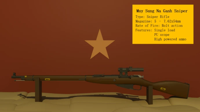 - Muy Sung Na Ganh Sniper – удлиненная версия винтовки с оптическим прицелом средней кратности для стрельбы по приоритетным целям на дистанции.