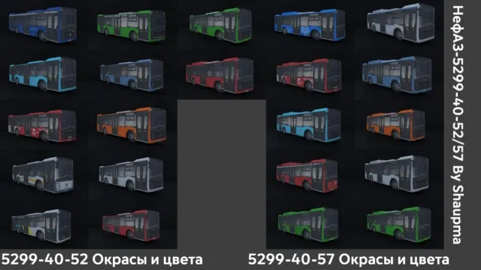 Мод «[SHWM] NefAZ-5299-40-52/57» для Teardown добавляет два типа российских городских низкопольных автобусов НефАЗ-5299-40-52 и НефАЗ-5299-40-57, выпускаемых с конца 2010-х годов. Автобусы предназначены для городских пассажирских перевозок, имеют низкую посадочную высоту и адаптированы к российским условиям эксплуатации. Доступны разные цвета и окраски городов – все варианты показаны на первом скриншоте мода.