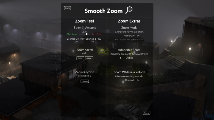 Настройки скорости и диапазона зума доступны в опциях мода.