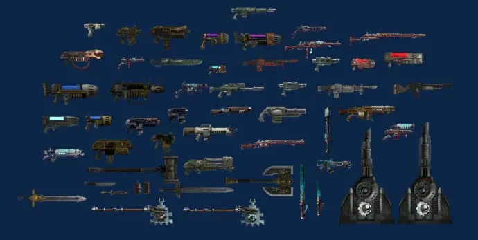 Мод добавляет оружие и броню: от стаб-пистолета до болтеров и ксенотеха. Для их создания нужны новые материалы: керамит, адамантий, термоплас, биоматериалы. Введены стационарные орудия – лазпушки, макроорудия, нова-пушки и болтерные турели.