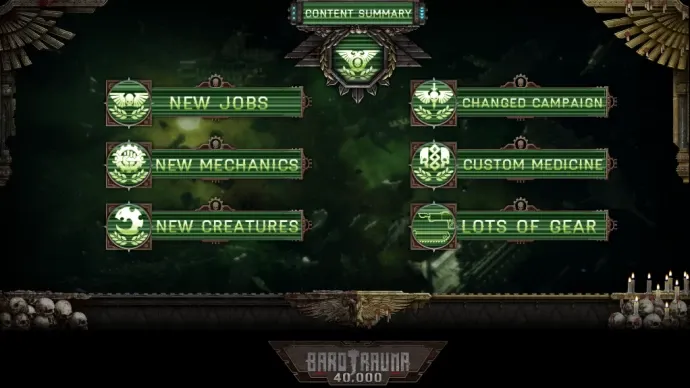 Добавлены новые профессии: имперский гвардеец, техножрец, скитарий, сестра битвы и другие. Боевая система переработана – изменён ИИ врагов, увеличено число атак, переработана медицина. Морфин и опиум теперь обезболивающие, лечение происходит с помощью биогелей, хирургических наборов и медкоек.